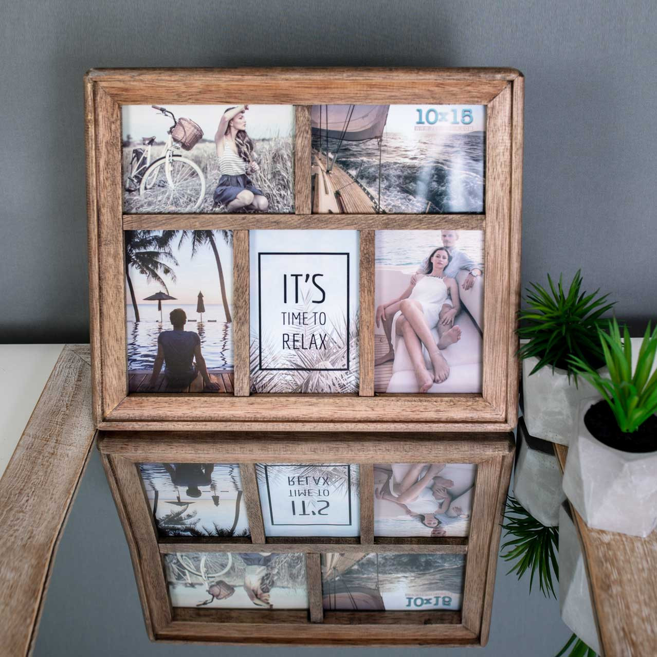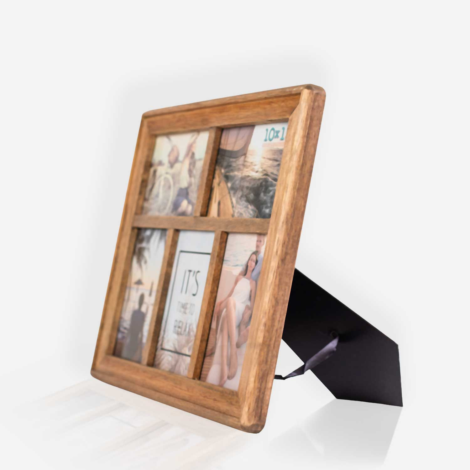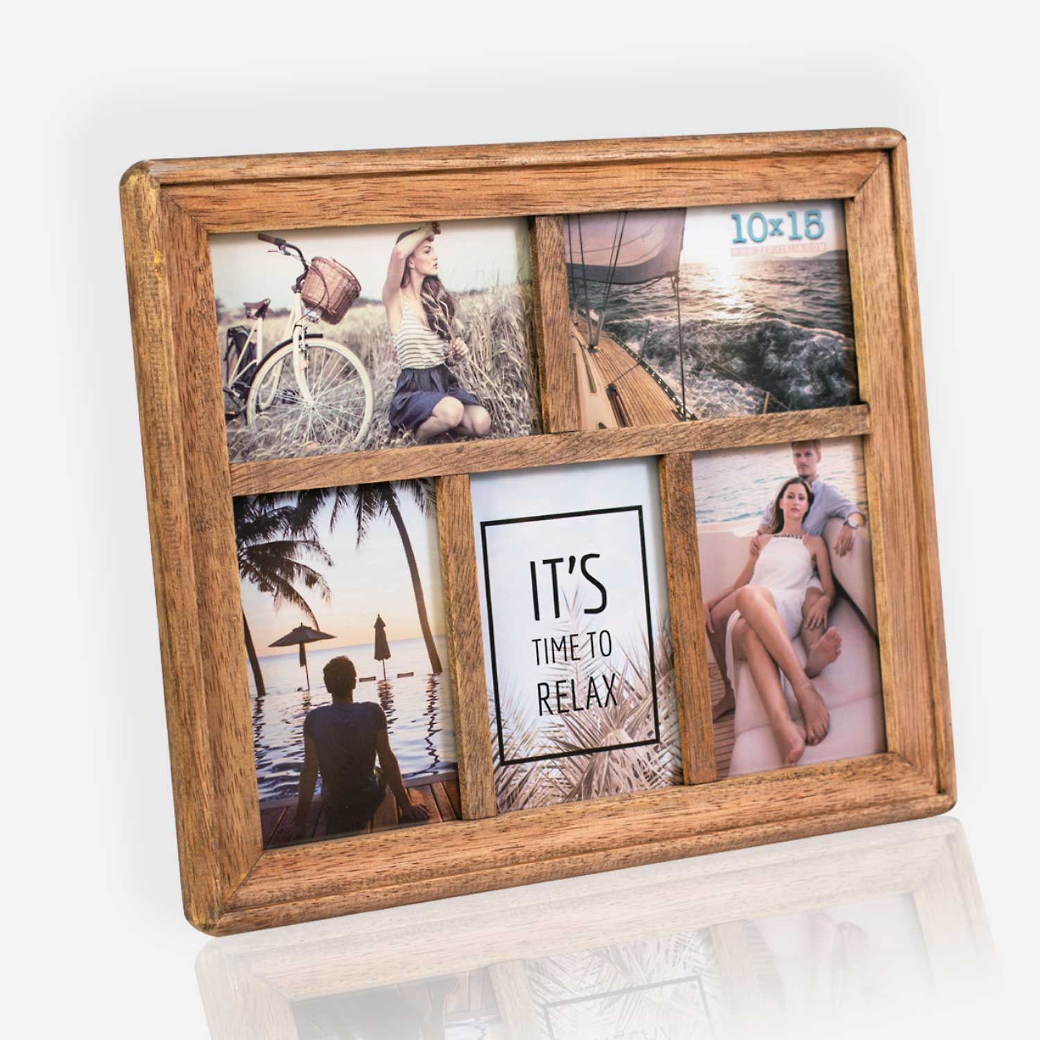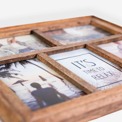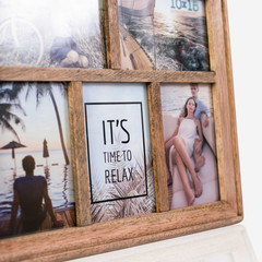 -drveni okvir smeđe boje -za 5 fotografija (2 vodoravne i 3 okomite) veličine 10x15 -kukica za vješanje na zid