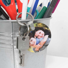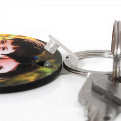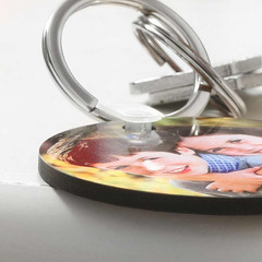 - drveni privjesak - metalni prsten za ključeve - za jednu fotografiju dimenzija 5 x 5 cm - veličina privjeska 5 x 7.5 cm - po želji promijenite fotku i tekst